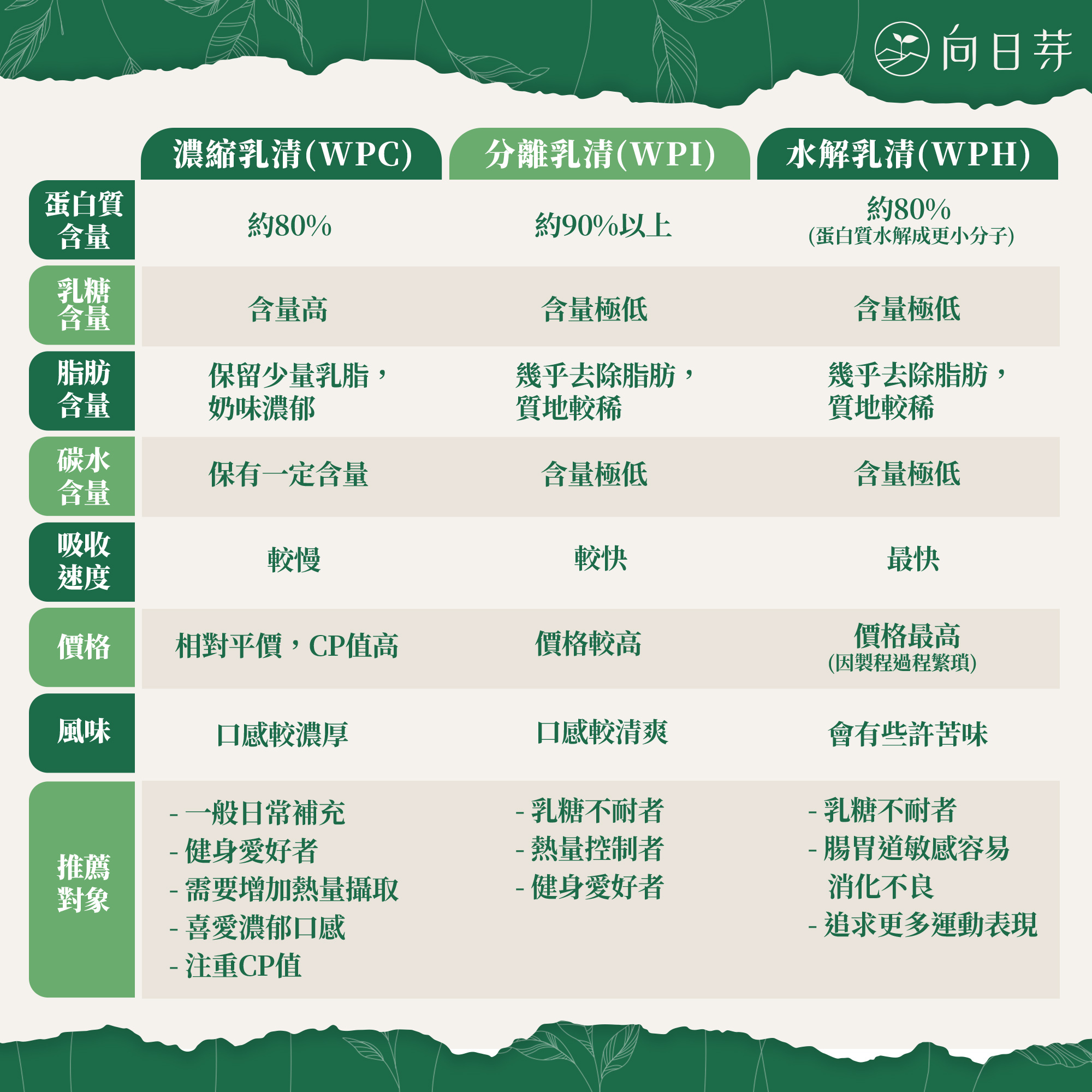 若想要的目標是增肌,並達成更好的運動表現,吸收率高的乳清蛋白會是更好的選擇;而以控制熱量攝取,無乳糖又富含豐富營養素的大豆蛋白、豌豆蛋白會是不錯的選擇;也可以選擇複方添加益生菌等的乳清蛋白。