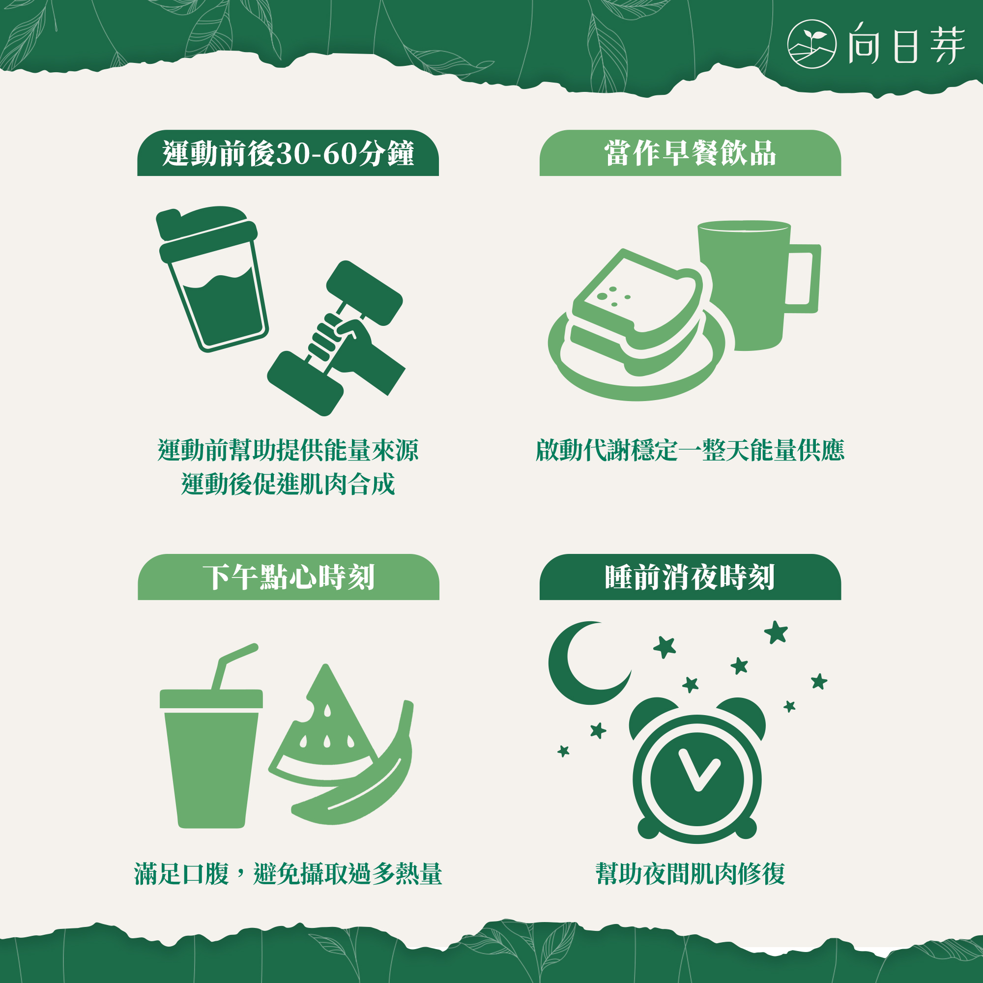 運動前搭配少量碳水幫助提供能量來源;運動後補充促進肌肉合成及過程中的能量消耗幫助修復。