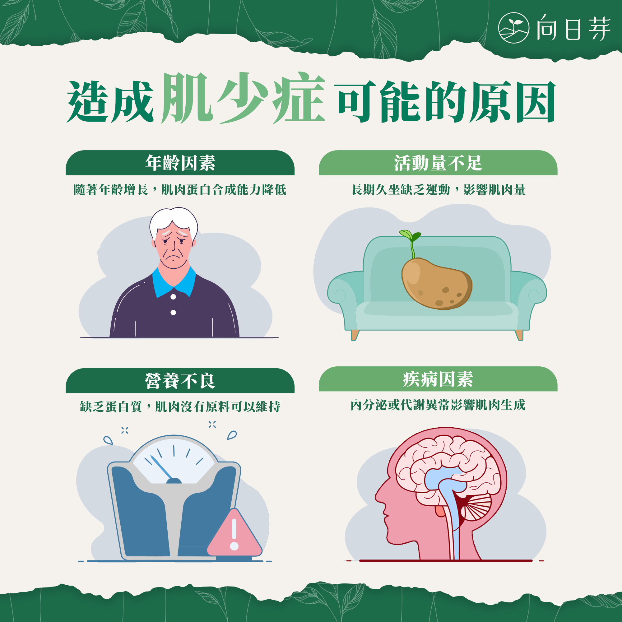 1. 年齡因素:隨著年齡增長,肌肉蛋白合成能力降低,造成肌肉自然流失。