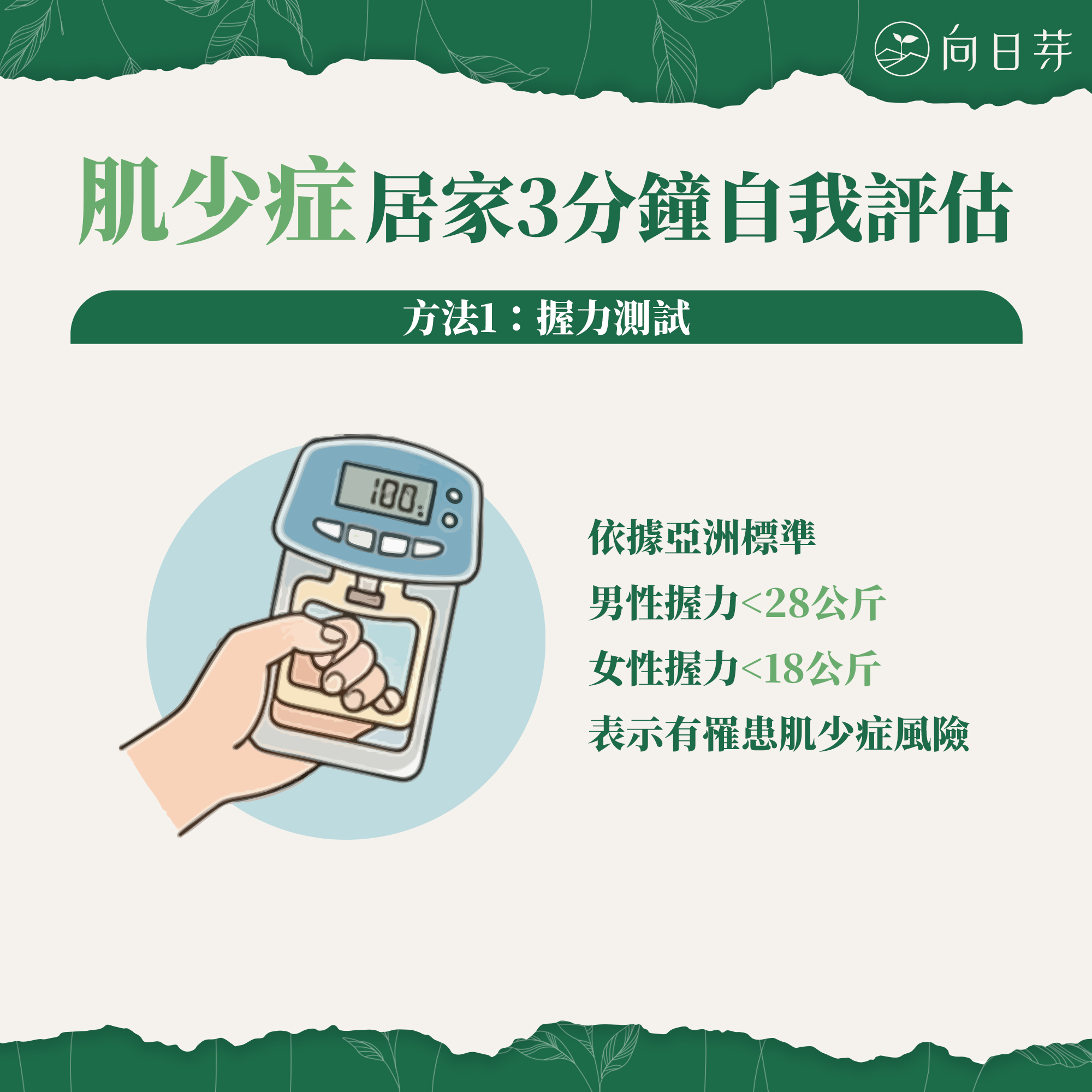 ➤ 男性握力若 小於 < 28公斤,表示有罹患肌少症風險。