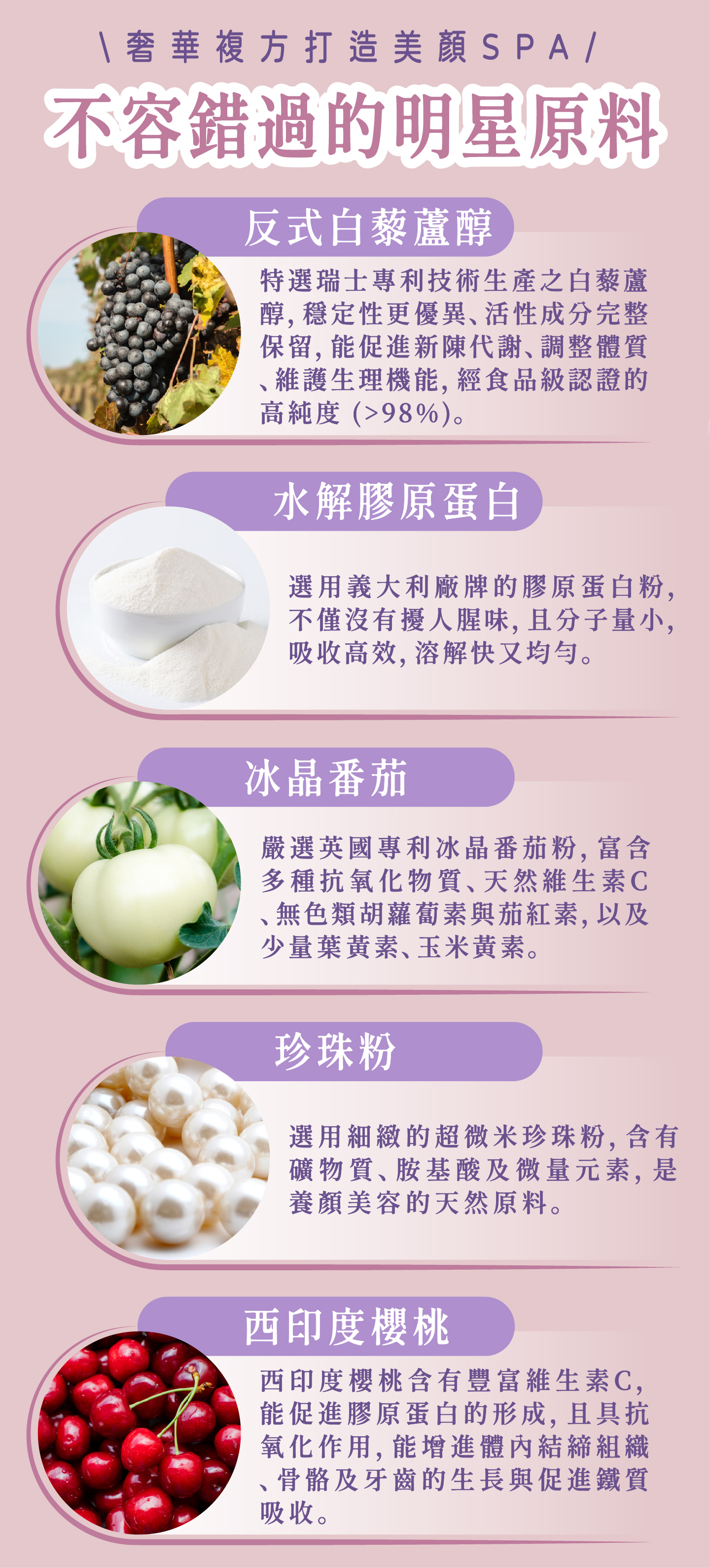 反式白藜蘆醇、水解膠原蛋白、冰晶番茄